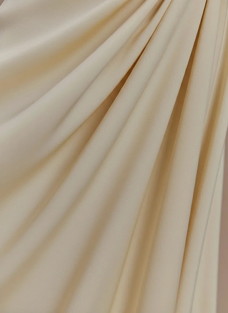 Crafted from a luxurious, flowing fabric, this dress promises sublime comfort and a radiant glimmer. To maintain its allure, a gentle, bespoke care routine is recommended, ensuring its timeless elegance endures.