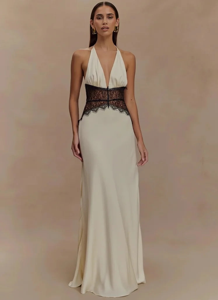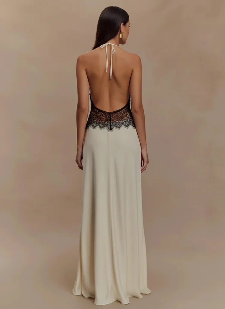 The alluring backless design and deep V-neck are meticulously crafted to highlight your magnetic presence. Patchwork lace adds a refined touch, ensuring you command attention with effortless grace.